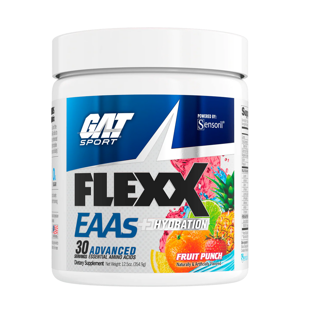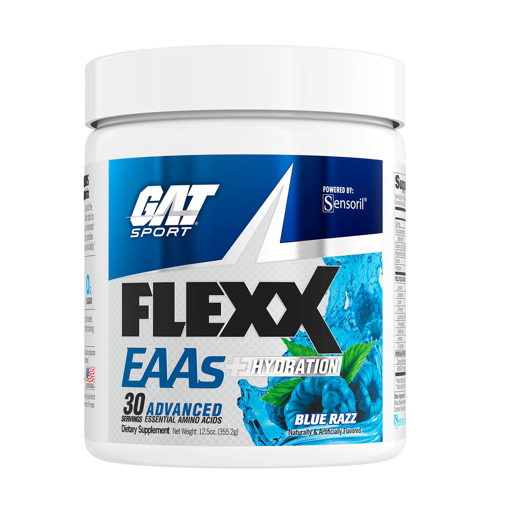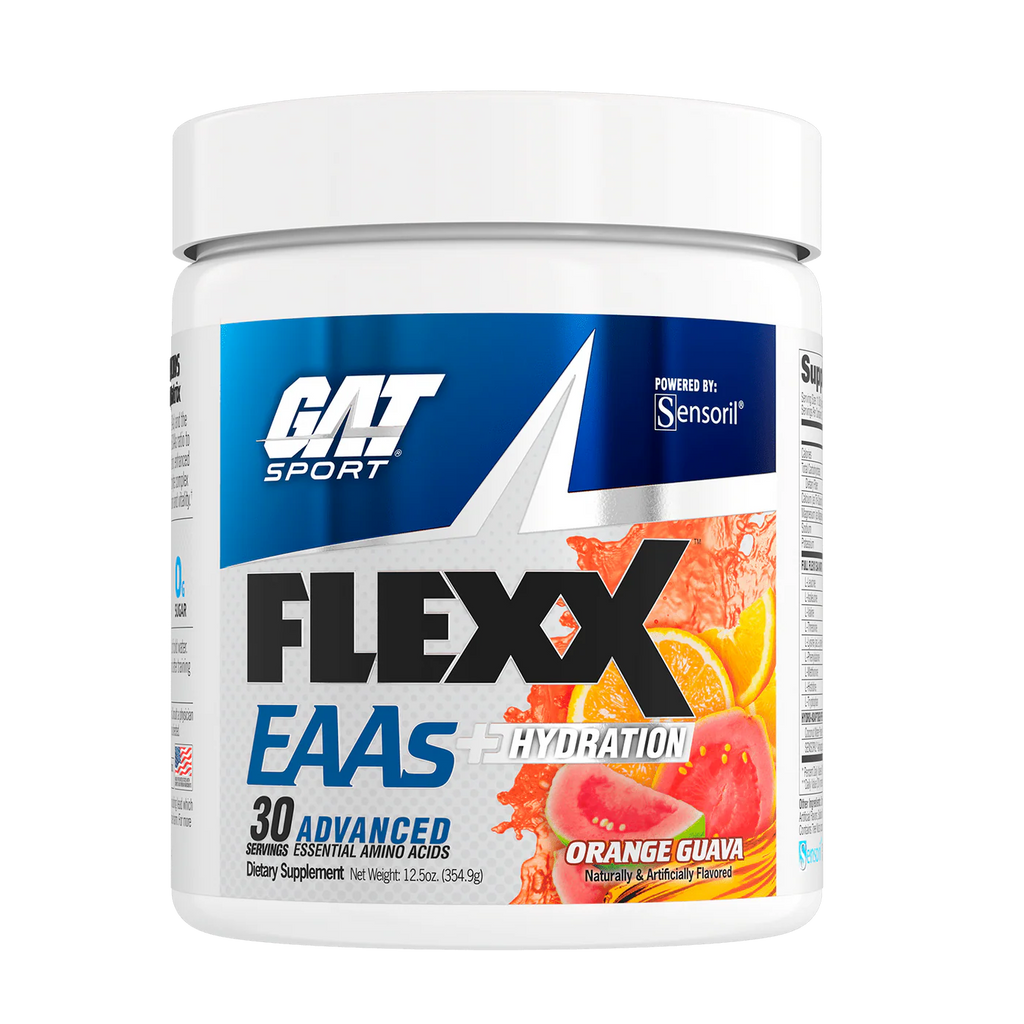 Gat Sport Flexx EAAs + Hydration delivers all 9 Essential Amino Acids (EAAs) for complete muscle protein synthesis. The result: Muscle preservation, energy, enhanced endurance, and recovery. This total amino acid profile features 7g of EAAs, with 5g in the clinically preferred 2:1:1 ratio. For stress mitigation and improved vitality, it includes 125mg of the adaptogenic herb Sensoril® Ashwagandha. Our amazing flavors provide hydration support that’s truly delicious, anytime: Pre, Intra, and Post-Workout. For the hard training athlete, FLEXX EAAs is the complete muscle and recovery solution.