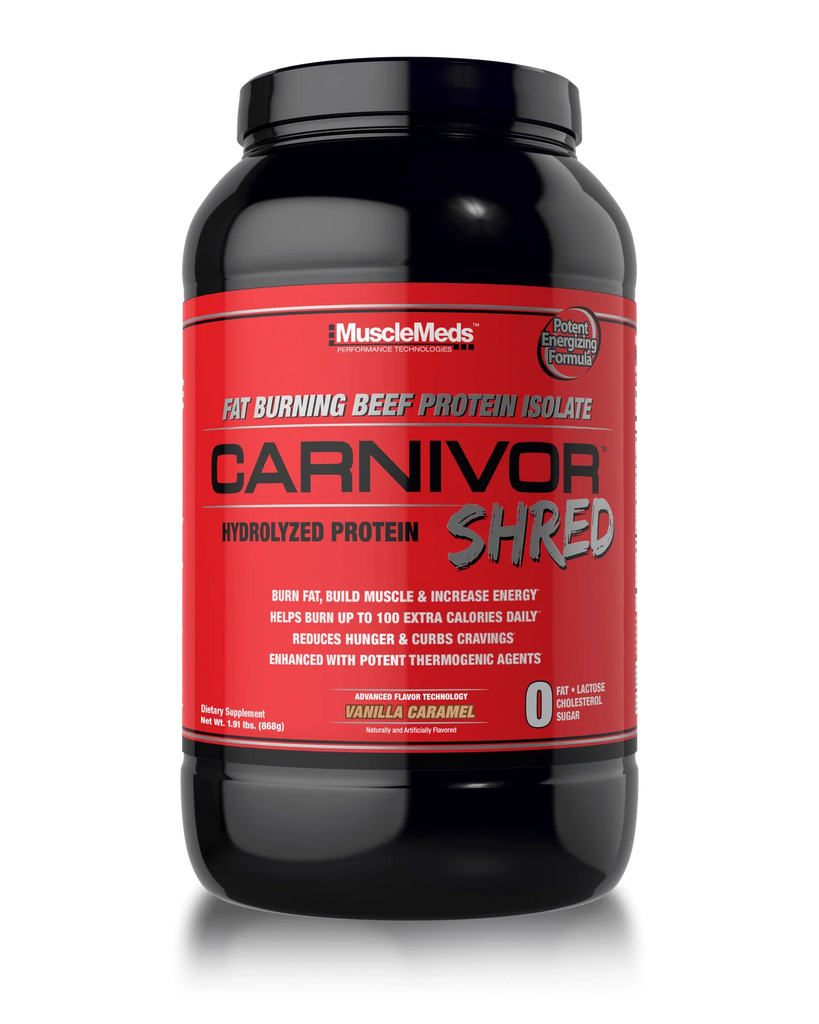Musclemeds Carnivor Shred Beef Protein is the ultimate fat burning and muscle building solution, featuring the incredible power of CARNIVOR Beef Protein Isolate and powerful shredding agents such as Super 6-Paradol, green tea, yerba mate and green coffee bean. Carnivor Shred helps activate brown adipose tissue (BAT) and boosts your metabolism to get you ripped. Clinical research shows that hard training male athletes supplementing with CARNIVOR BPI gained an average of 7.7 lbs. of muscle mass in just 8 weeks, a 6.4% average increase in lean body mass, while the placebo group only increased lean body mass by 0.7 lbs. from baseline. The study also revealed that athletes who used CARNIVOR BPI increased their total combined bench press and deadlift 1-rep max by 147.7 lbs., while the placebo group only increased total strength by 82.6 lbs. from baseline.+ These impressive findings validate the muscle and strength building effects of Musclemeds Carnivor Shred Beef Protein. Whey is an excellent source  of high  quality protein, Whey protein promotes muscle growth & strength, Whey protein can help you lose weight, Reduce appetite and hunger levels.