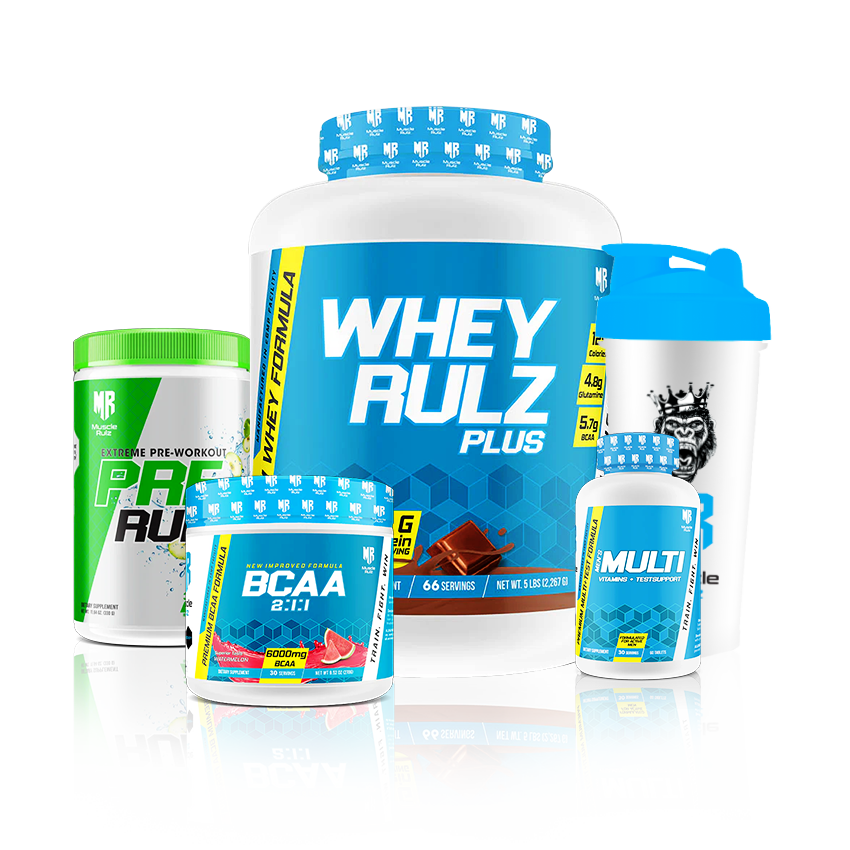 Muscle Rulz Bundle - Whey Rulz Plus Chocolate 66 Servings + BCAA Watermelon 30 Servings + Extreme Pre-Workout Pre Rulz Green Apple 30/60 Servings + Muscle Rulz Multivitamin + Test 30 Servings + Shaker