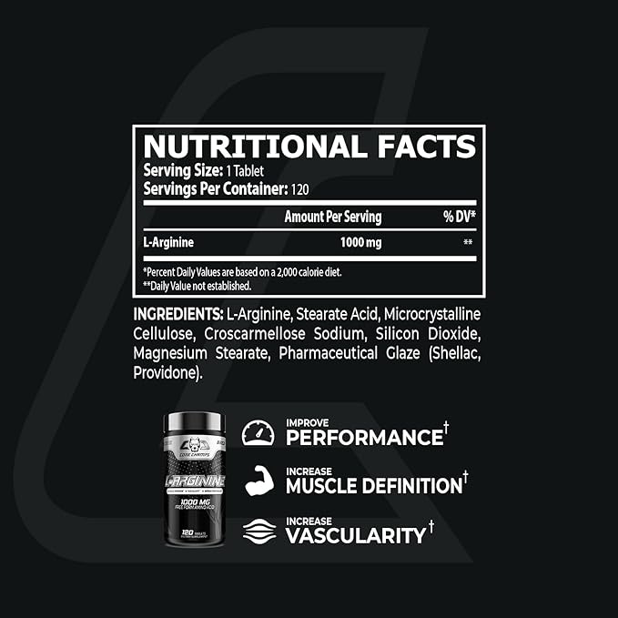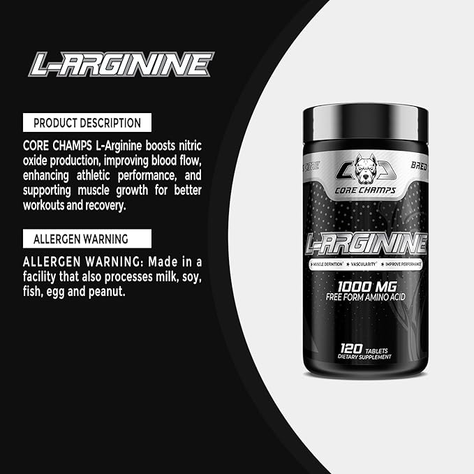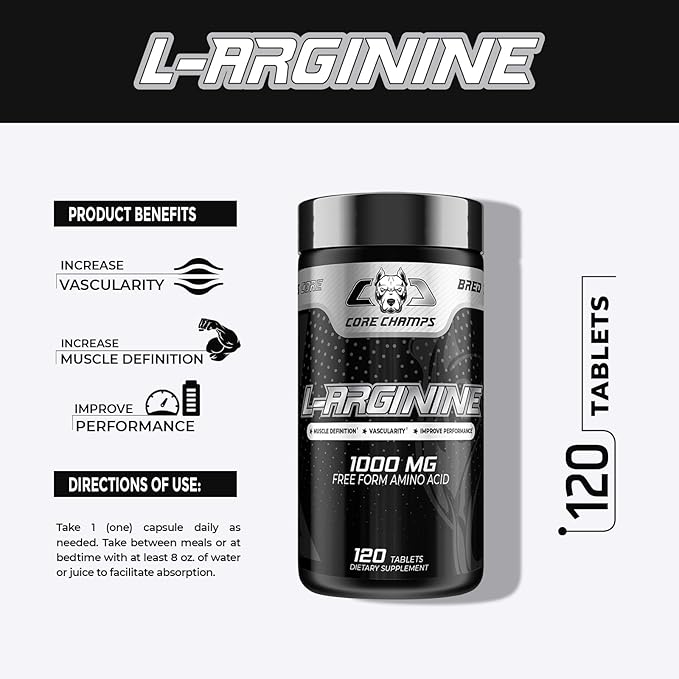 Core Champs L-Arginine 1000mg is a scientifically superior formula that supplies your body with 1,000mg of L-Arginine, an amino acid that kick-starts a process to give you skin-splitting pumps.L-Arginine is a precursor to nitric oxide, which helps relax blood vessels, allowing more blood-carrying nutrients to rush through your system.L-Arginine disperses lightning-fast,flooding your body with the powerful nitric oxide precursor primes for extreme pumps,enhanced blood flow,and nutrient delivery.